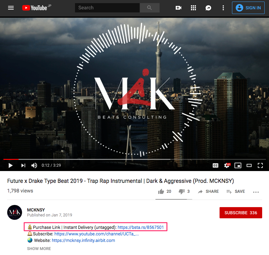 YouTubeで気に入ったタイプビートを見つけたら、その動画の説明欄に記載されている購入リンクからBeatStarsやAirbitといった、ビート販売サイトへ行き、そこでビートの音源と使用権をすぐに購入することができます。